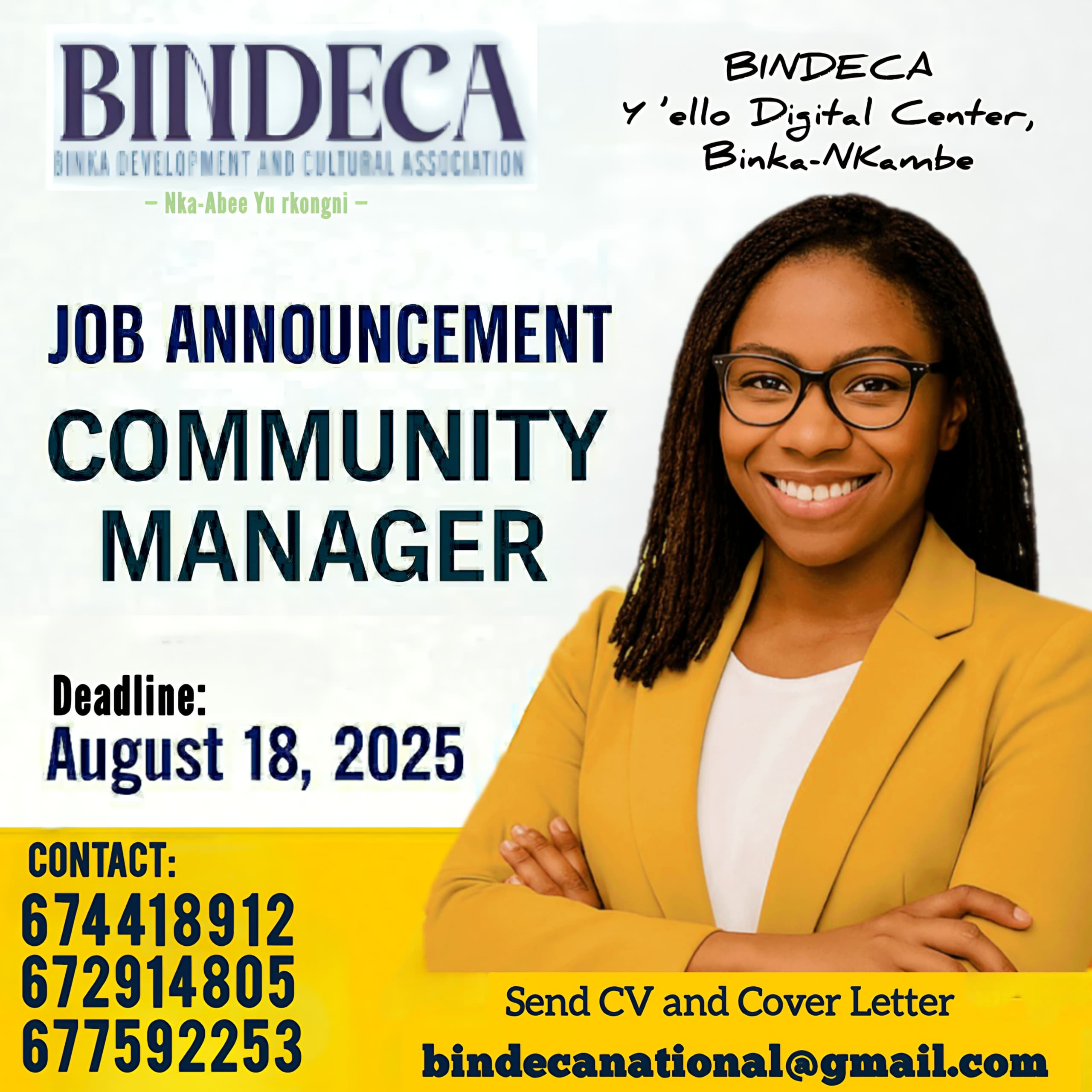 Use the subject line: Application – Community Manager, Y’ello Digital Centre Binka, including: