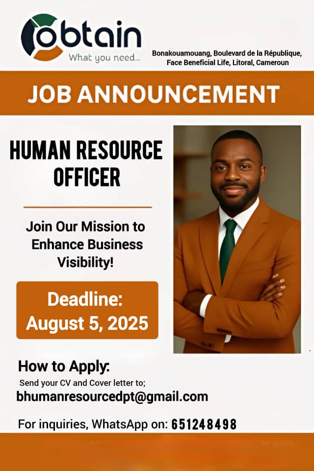 Obtain Cameroun, a leading provider of printing and outdoor advertising solutions in Cameroon, is seeking a skilled and motivated Human Resource Officer to join our dynamic team. Guided by our mission to enhance business visibility through innovative advertising solutions, this role offers an opportunity to drive HR excellence and support our growing workforce.