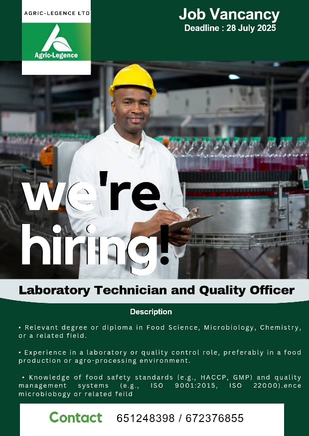 * Experience in a laboratory or quality control role, preferably in a food production or agro-processing environment.