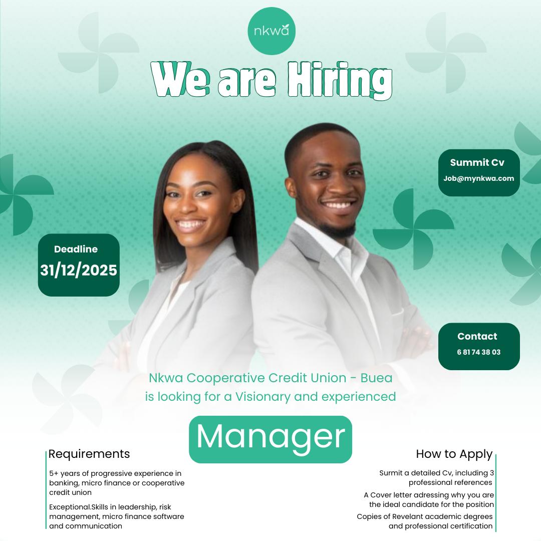 Nkwa Cooperative Credit Union Ltd is hiring a Manager in Buea, Cameroon. This leadership role requires a minimum of five years in banking or microfinance, focusing on strategic leadership, operational management, and community engagement. Interested candidates should submit their CV, cover letter, and certifications by December 31st, 2025. Nkwaccul is an Equal Opportunity Employer dedicated to promoting financial inclusion and community empowerment.